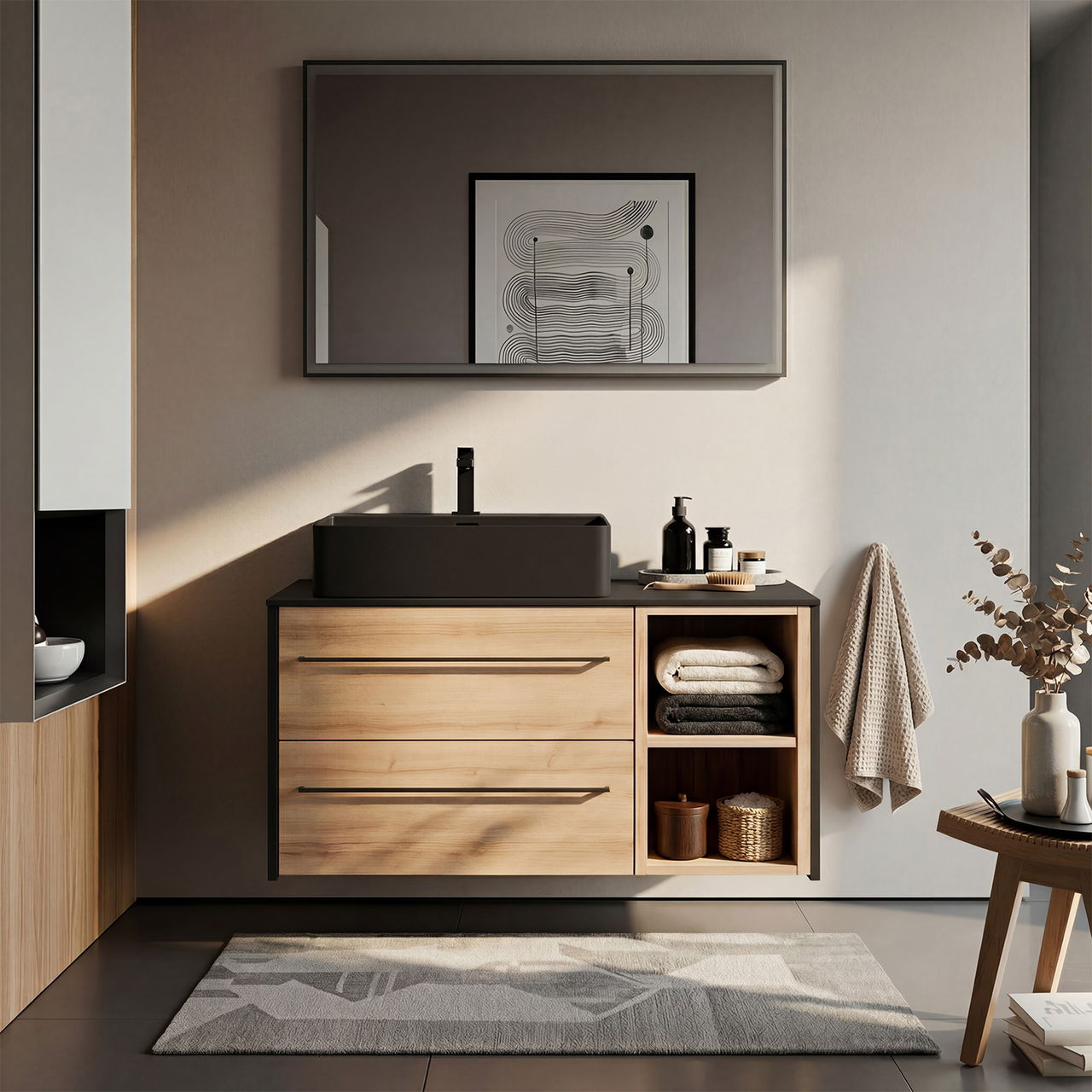 Darauf sitzt das schwarze Keramik Aufsatzbecken. Die Oberfläche ist pflegeleicht, die Form präzise gearbeitet und angenehm proportioniert. Der Kontrast zur Holzoptik wirkt bewusst gewählt und hochwertig.